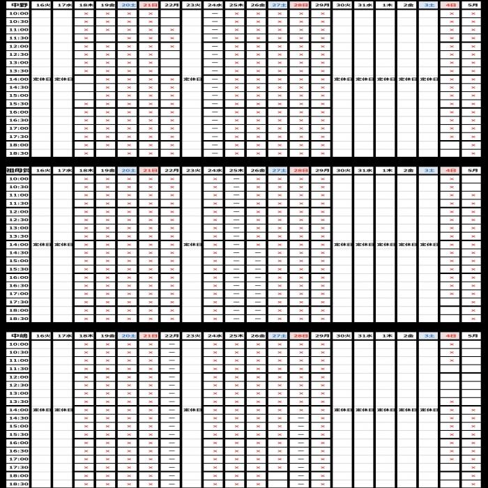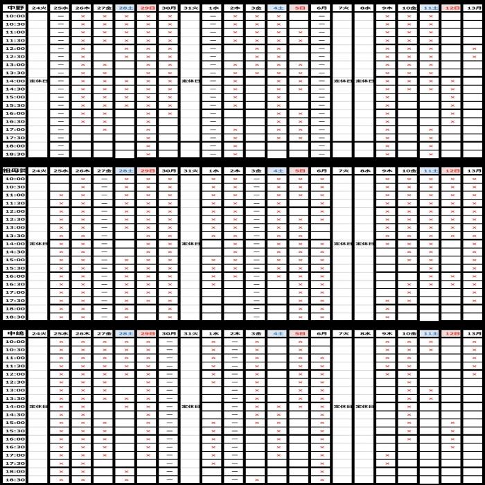 リアルタイム更新では無いので申し訳ございませんが、予約状況は変わっていきますのでご予定のご参考にして下さい。